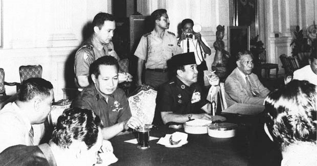 Johannes Leimena (paling kanan) diantara Presiden RI pertama Bung Karno dan Soeharto - web