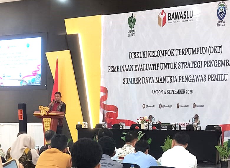AMBON, arikamedia.id – Badan Pengawas Pemilihan Umum (Bawaslu) menggelar Diskusi Kelompok Terpumpun (DKT) bertajuk “Pembinaan Evaluatif untuk Strategi Pengembangan Sumber Daya Manusia (SDM) Pengawas Pemilu” di ballroom Restoran Raja Seafood Ambon, Jumat,(12/09/2025).