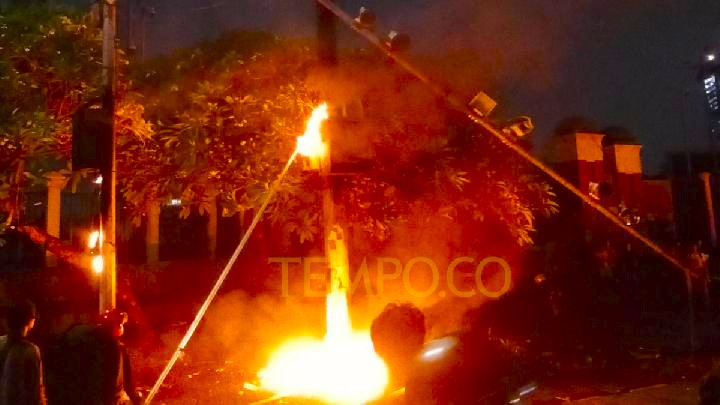 Demonstran menjatuhkan dan membakar tiang tilang elektronik di depan Gedung MPR/DPR/DPD, Jakarta, 30 Agustus 2025. Tempo/Sultan Abdurrahman