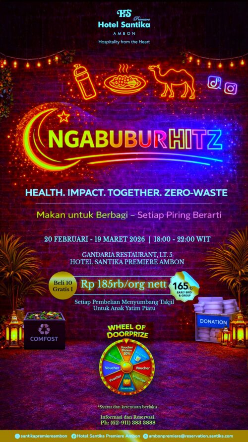 “Kami ingin menghadirkan konsep buka puasa yang relevan dengan tren saat ini, namun tetap memberi dampak positif bagi komunitas ngabuburhitz menggabungkan pengalaman visual yang ‘postable’ dengan aksi nyata seperti donasi, praktik zero-waste, serta edukasi singkat bagi tamu,” ujar Audra Pattiasina, Public Relations Manager Hotel Santika Premiere Ambon.