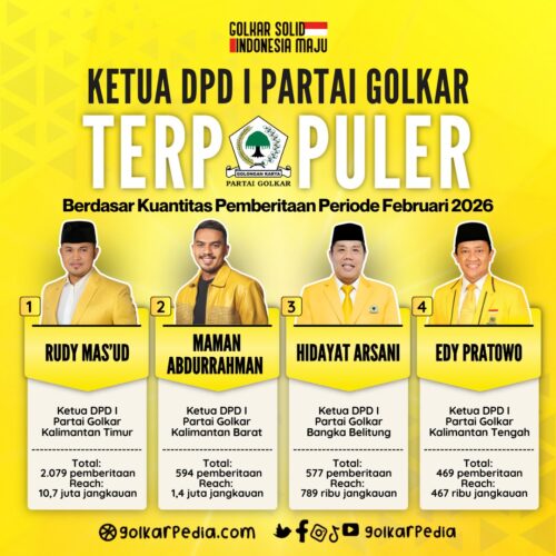 JAKARTA – Nama Ketua DPD I Partai Golkar Kalimantan Timur, Rudy Mas’ud yang juga menjabat sebagai Gubernur Kalimantan Timur berdasar hasil riset kami Golkarpedia.com menjadi Ketua DPD I Partai Golkar Terpopuler se-Indonesia untuk periode Februari 2026. Rudy Mas’ud menyalip posisi Maman Abdurrahman yang pada periode sebelumnya berada di posisi pertama. .