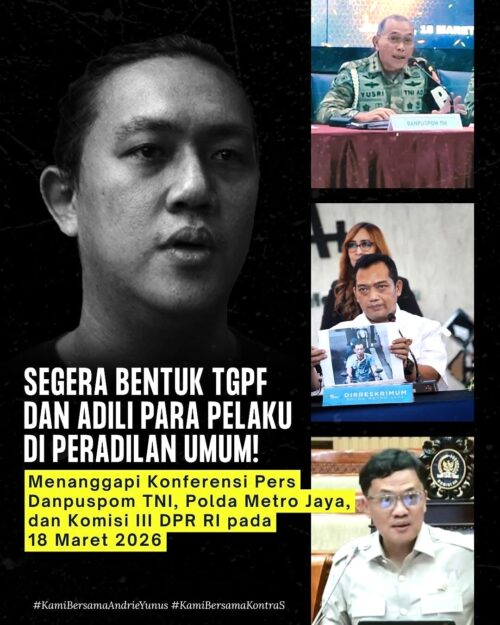 Di sisi lain, Polda Metro Jaya dalam konferensi persnya mengungkap inisial dua orang yang diduga menjadi pelaku tindak pidana. Kami juga telah mengamati konferensi pers Komisi III DPR RI yang pada intinya Komisi III DPR RI telah sepakat membentuk Panita Kerja (Panja) Komisi III DPR RI tentang Penyiraman Air Keras Pembela HAM Andrie Yunus.