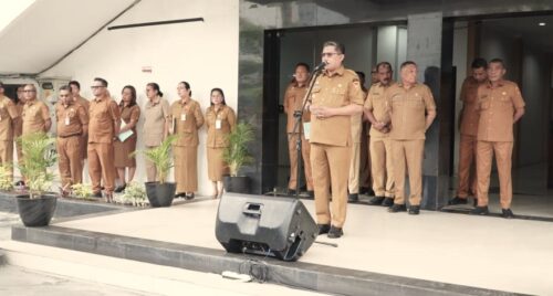 Wali Kota Ambon, Bodewin Wattimena memimpin apel pagi di lingkup Pemkot Ambon, Senin (19/01/26) - Istimewa.