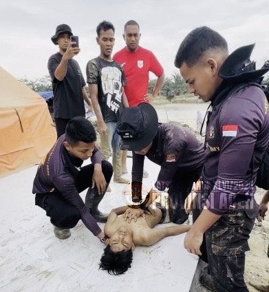 Melihat adanya anak yang hanyut, para taruna bersama warga sekitar dengan cepat melakukan upaya pertolongan.