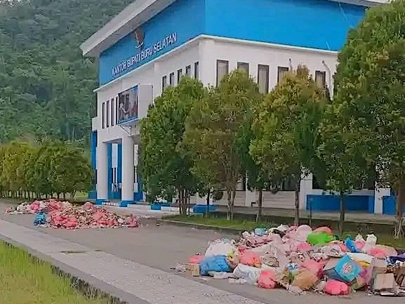 Sampah dibuang oleh para pengangkut sampah di depan Kantor Pemkab Bursel, karena gaji yang tidak diberikan selama 3 bulan - Ist